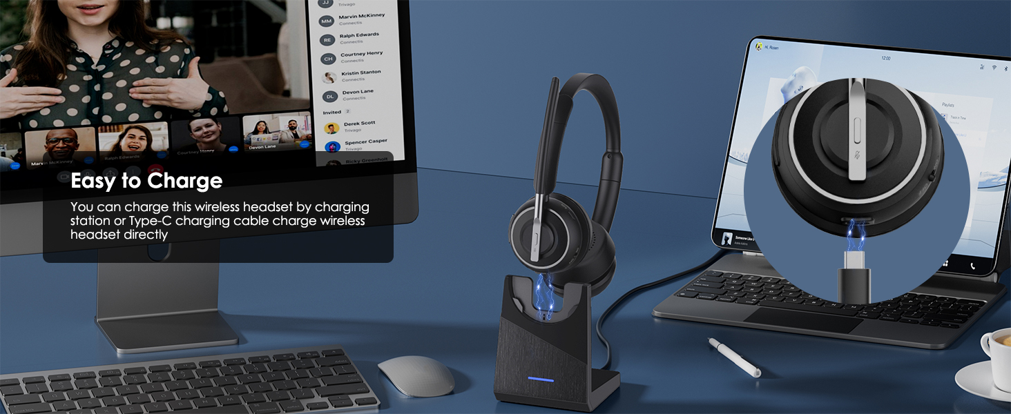· Immersive Stereo Sound for Work & Play: The Wireless headset for computer drivers eliminate distortion while delivering immersive stereo sound during music, podcasts, and video conferences across Zoom, Microsoft Teams, Webex, Skype, and other platforms, Experience rich, balanced audio with deep bass and crisp highs for both professional calls and entertainment. Tip:If you feel that there is noise in the sound quality of the headphones, please keep the USB/Bluetooth connection stable and ensure that there is no interference from other devices.