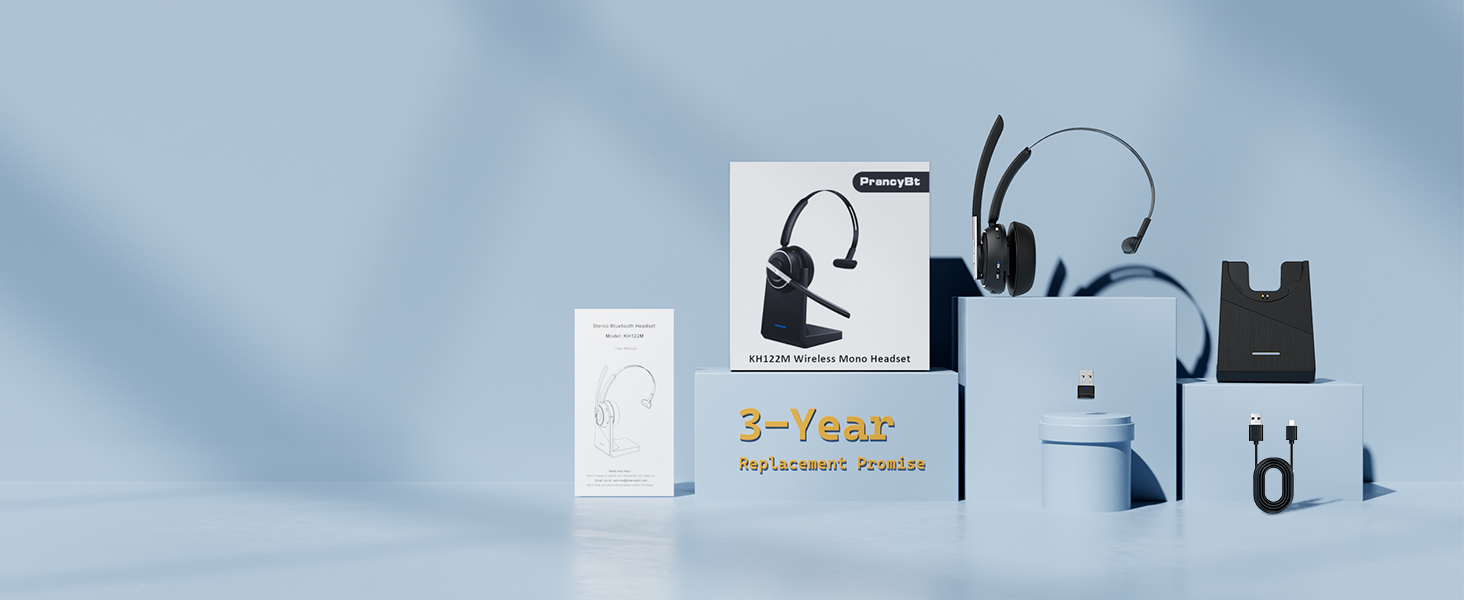 【More Protection. More Peace Of Mind】All PrancyBt wireless headsets with microphone for work are backed by a 3-year advanced warranty for peace of mind, which is 3 times longer than most other brands in the market, and our friendly support is always available, even after your warranty expires. What you get: wireless Bluetooth headset with microphone x1, charging stand x1, USB dongle x1, Type-C charging cable x1, user manual x1.